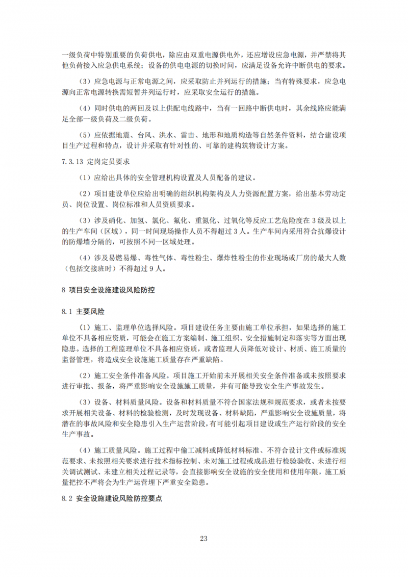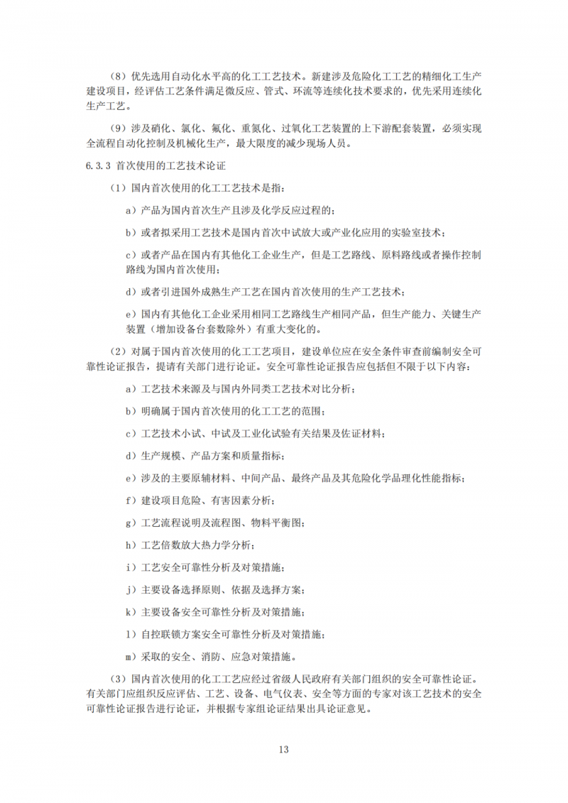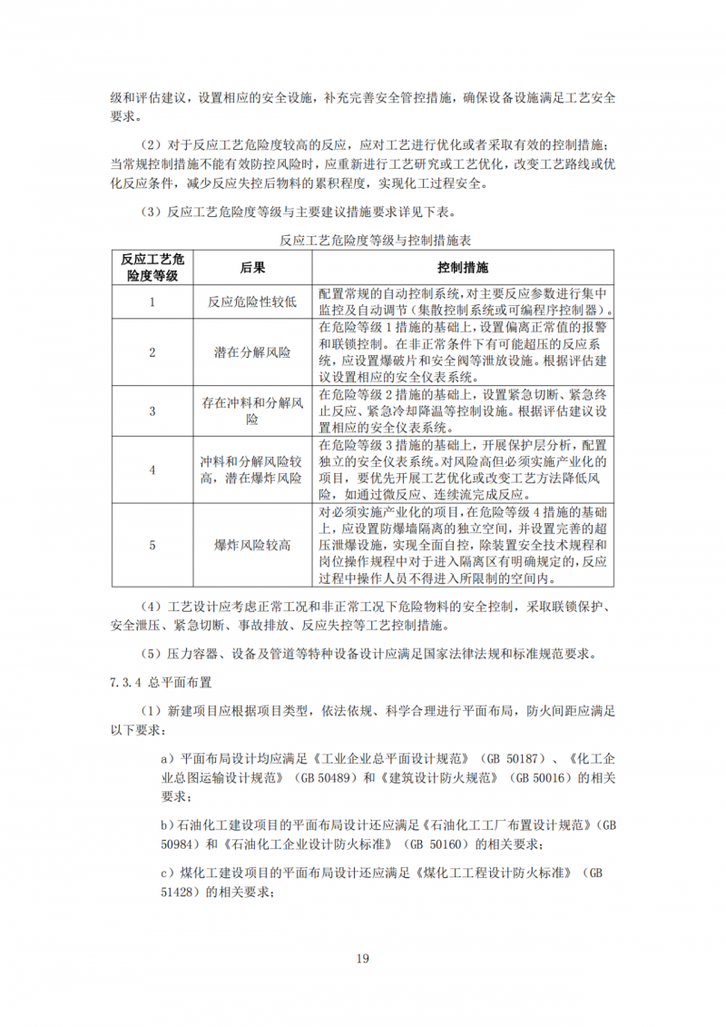 规定了安全评价报告编制、工艺技术选用、首次使用的工艺技术论证、反应安全风险评估、项目选址与周边设施相互影响、项目依托条件及自然条件影响、项目规划布局和关键设备设施选型等8个方面的安全风险防控要点。