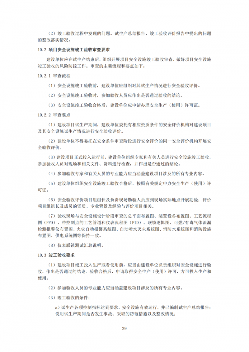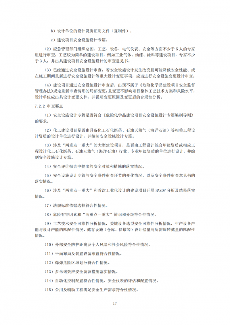 规定了审查的主要流程,明确了安全验收评价单位、安全设施竣工验收、验收专家和有关人员的专业能力、安全生产(使用)许可证申办、现场勘验、验收现场与安全设施设计阶段审查一致、仪表联锁测试汇总说明等8项审查要点。