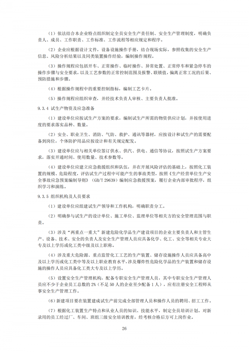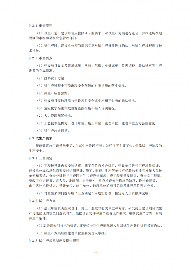 规定了三查四定、试生产方案、试生产规章制度及操作规程、试生产物资及应急准备、组织机构及人员要求、联动试车、开车前安全审查(PSSR)、投料试车、试生产时间等9个方面的试生产要求。