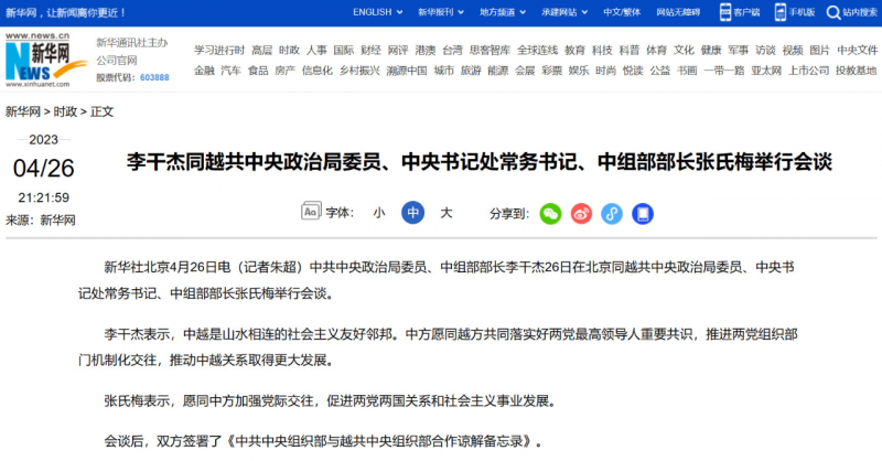 据新华社消息,中共中央政治局委员、中组部部长李干杰26日在北京同越共中央政治局委员、中央书记处常务书记、中组部部长张氏梅举行会谈。